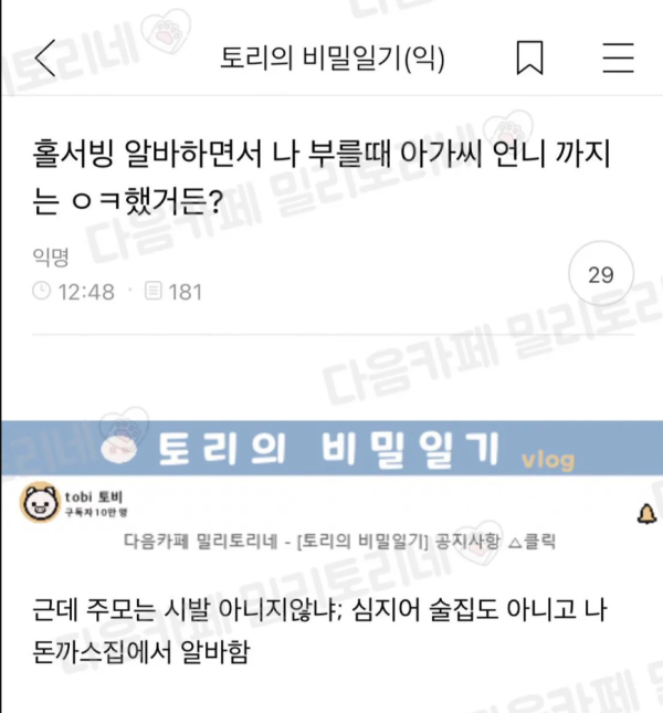 홀서빙 알바하다가 상상도 못한 호칭에 분노한 사람 작성자 정보 최고관리자 작성 작성일 2022.07.17 11:20 컨텐츠 정보 목록 본문 홀서빙 알바하다가 상상도 못한 호칭에 분노한 사람 관련자료 이전 품격있게 사람패기 작성일 2022.07.17 11:21 다음 강남 음주 단속 현장 -명언- 작성일 2022.07.17 11:18 댓글 0 등록된 댓글이 없습니다. 로그인한 회원만 댓글 등록이 가능합니다. 목록